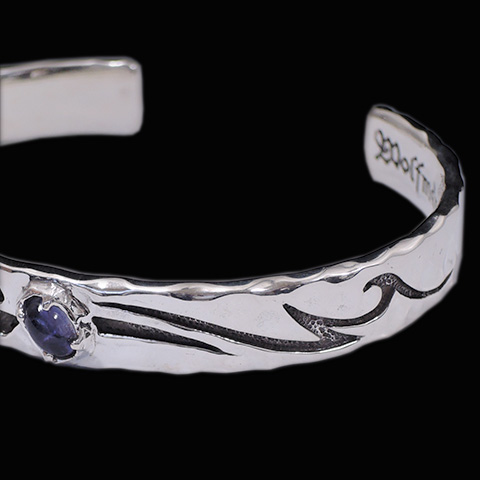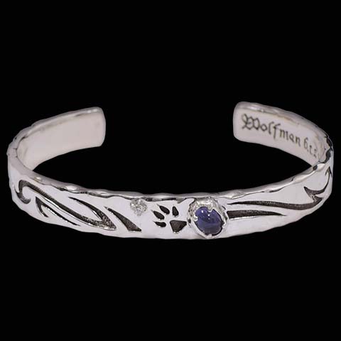 中央には狼の足跡とオーバルカボションのアイオライトをセットし大人の雰囲気を演出。