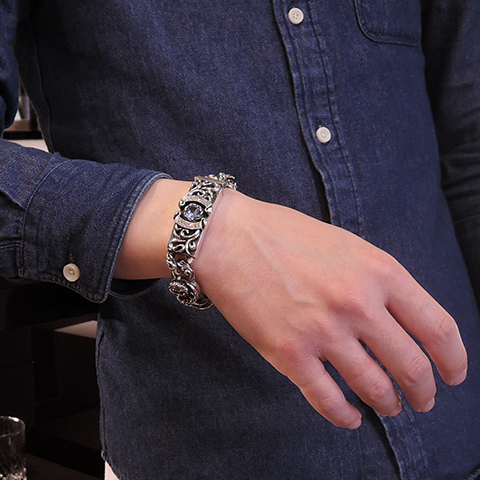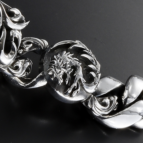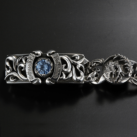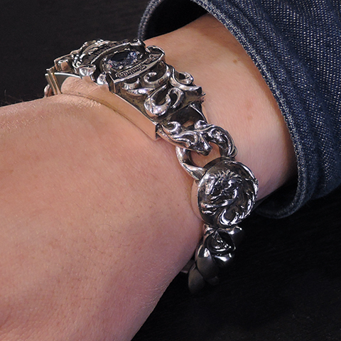 両サイドに立体的な「ホワイトファングウルフ」のコンチョがセットされたウルフマンとのコラボブレスレット。