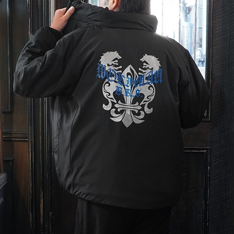 ウルフマンBRSから、この冬注目の新作中綿ブルゾンが登場。程よいボリュームの中綿で軽さと保温性を両立し、タウンユースからバイクシーンまで幅広く活躍します。背面にはウルフマンBRSの象徴的なデザイン“ウルフウレア”を迫力あるプリントで表現。前胸にはブランドアイコンのムーンウルフ配置し、ブランドらしい無骨さと高級感を演出しています。首元を温めてくれるスタンドカラーは、スタイリッシュながら機能性も兼ね備えた仕上がり。ブラックを基調とした落ち着いたカラーは、どんなスタイルにもマッチします。この冬の定番アウターとして長く愛用できる一着です。