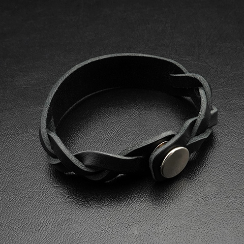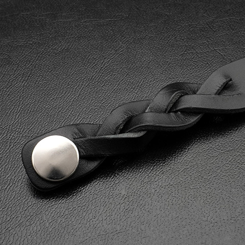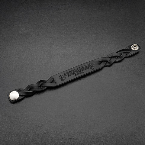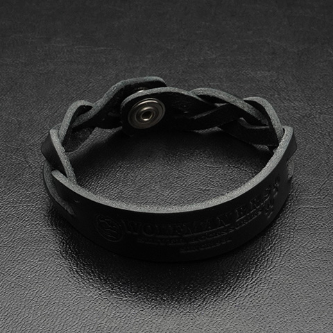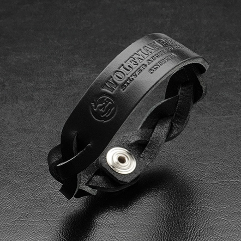 ウルフマンB.R.Sが放つ、存在感あふれる 編み込みレザーブレスレット。滑らかなブラックレザーを編み込み、中央のプレートには ブランドロゴ、ムーンウルフ、そして狼の足跡を力強くエンボス。静かな迫力と洗練さを同時にまとった一本です。無駄のないミニマルなフォルムに、レザーが持つ深みとワイルドなアクセントが融合。どんなスタイルにも自然に溶け込み、さりげなく個性を引き立てます。スマートなスナップボタン仕様で着脱もスムーズ。ウルフマンらしい“静かに研ぎ澄まされた美学”を手元に。