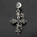 ユリと十字架を融合させたゴシックテイストなクロスにブランドのメインモチーフである『狼』が絡まるように巻きついたペンダント。程よいサイズ感でどんなスタイルにも合わせやすく、さりげなく胸元を飾ってくれます。月と星がデザインされたバチカンは、細いチェーンから太めのチェーンや三つ編み紐まで対応できるサイズになっています。