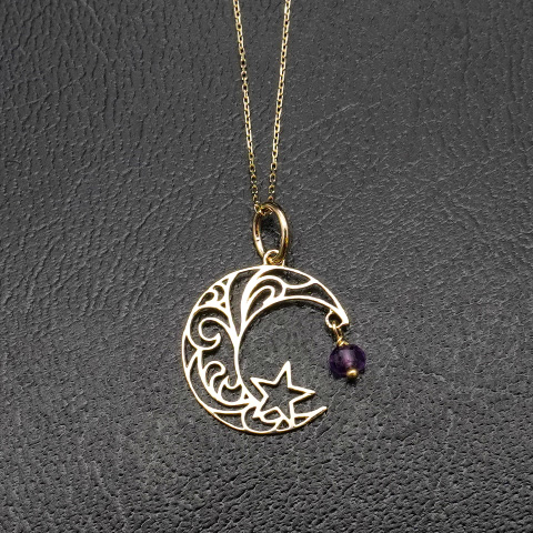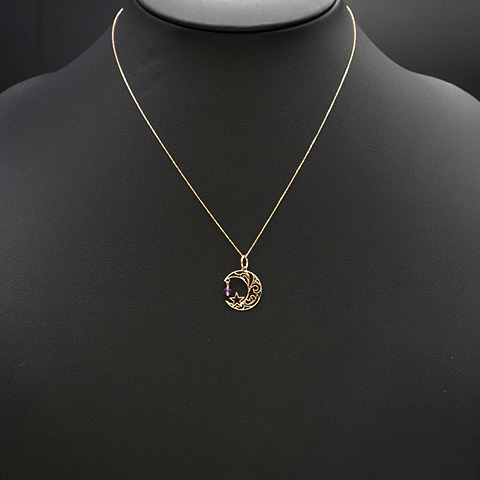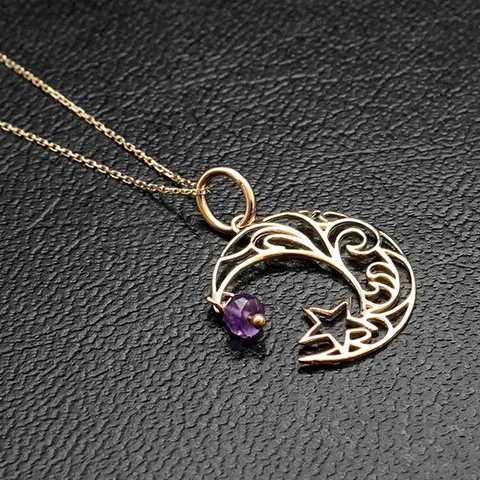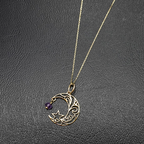 透かしの流曲線が美しい10Kの三日月の先には、シャンク巻きで留められたアメジストがゆらゆらと揺れ動き、