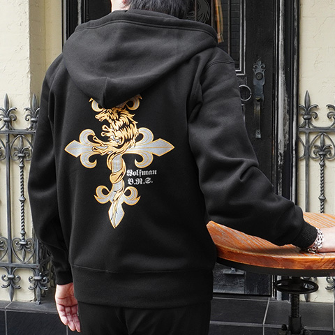 力強くも神秘的な存在感を放つ“セイクリッドウルフ”が、ウルフマンBRSの世界観を纏ってこの秋冬に新作パーカとして登場。ゴールド×シルバーメタリックプリントで表現された神聖な狼が、見る者を魅了する大胆なバックデザイン。フロントにも同様のデザインを配置し、ストリートとスピリチュアルが融合した独自の美学を体現。裏地にはふんわりとした裏起毛素材を採用し、秋冬シーズンに最適な暖かさと着心地を実現。ユニセックスで着用できるサイズ展開で、オーバーサイズでの着こなしもおすすめです。カラー展開は、ブラックとバーガンディの2色展開となっています。