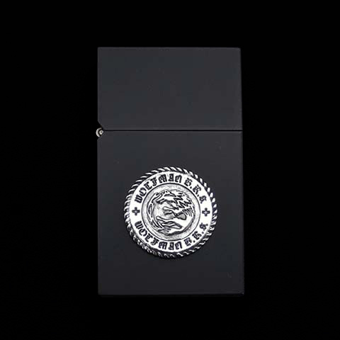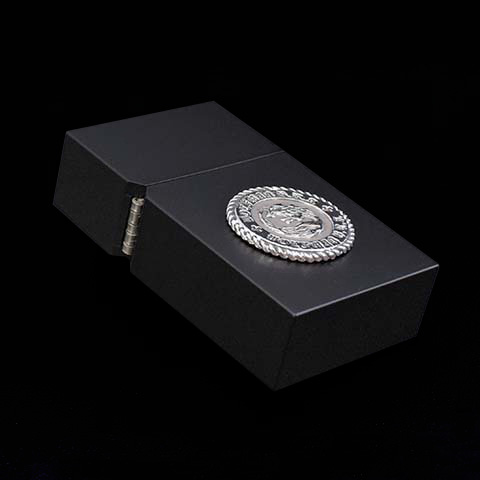 丸みを廃したエッジの効いたスクエアボディのオイルライター。どこかクラシカルな雰囲気を感じさせるコインモチーフとつや消しブラックのボディがマッチしたシックなデザイン。厚みのあるケースはポリカーボネートを採用し、シンプルながらも機能性を兼ね備えたデザインになっています。