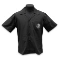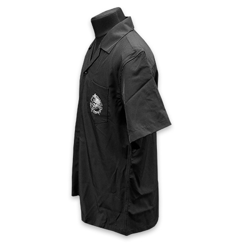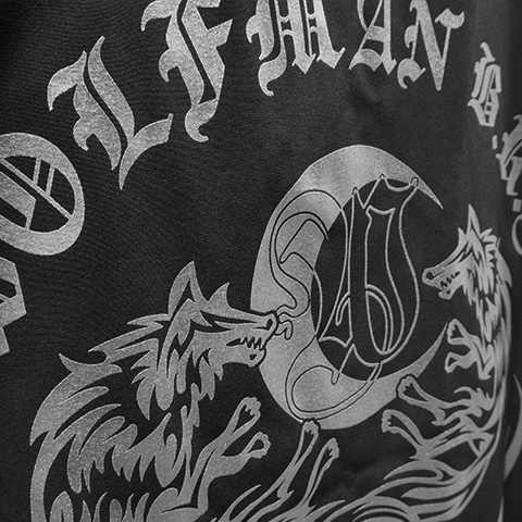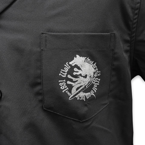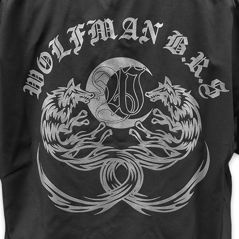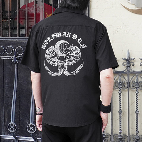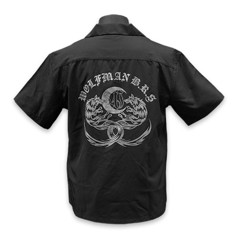 ややゆとりのあるシルエットで、大人の為のデイリーウエアに最適なオープンカラーシャツ。細身のパンツでメリハリのあるスタイルはもちろん、ワイドシルエットのパンツと合わせると旬のスタイルに。背中には2匹のケルティックウルフが向かい合うように描かれたスタイリッシュなデザインに仕上がっています。