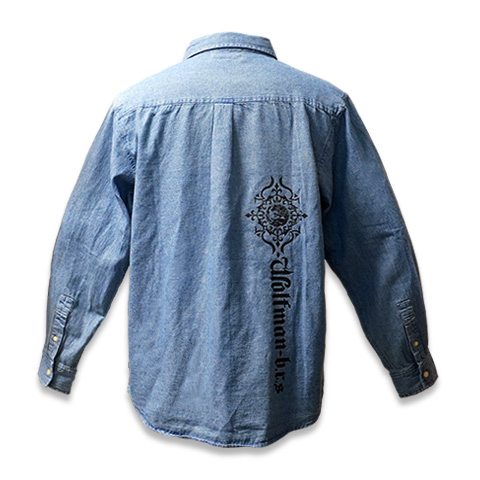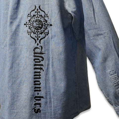 ごわつきすぎない程よい厚みの6オンスのデニム生地を使用した長袖デニムシャツ。胸元にはワンポイントのロゴと狼モチーフをさりげなく配置。背中の片側には縦長ロゴをプリントし、シンプルな中にもエッジを効かせたデザインに仕上げました。肩が落ちるドロップショルダーとゆったりとした身幅で、リラックス感のあるシルエットを演出します。デニム特有の色むらやアタリを楽しめ、着込むほどに増していくユーズド感は、時間とともに自分だけの表情へと育つ一着です。一枚でさらっと着るのはもちろん、羽織りとしても活躍する春の主役アイテム。