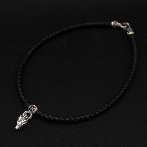 ブラックレザーの落ち着いた雰囲気は付属のペンダントトップを見事に引き立て、シンプルになり過ぎず程良いボリューム感も得られる四つ編みレザーネックレス。